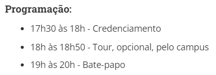 Ok, agora que vocês já sabem o que esperar da semana de boas-vindas, vamos à programação: