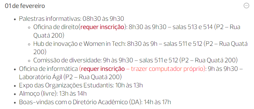 As palestras informativas visam introduzir de forma um pouco mais profunda as atividades e projetos realizados pelo Insper. A única palestra informativa cuja inscrição é necessária é a da Oficina de Direito. Aos alunos que desejarem participar, inscrevam-se por meio do link a seguir: https://www.even3.com.br/oficina_direito_boasvindas_20241/