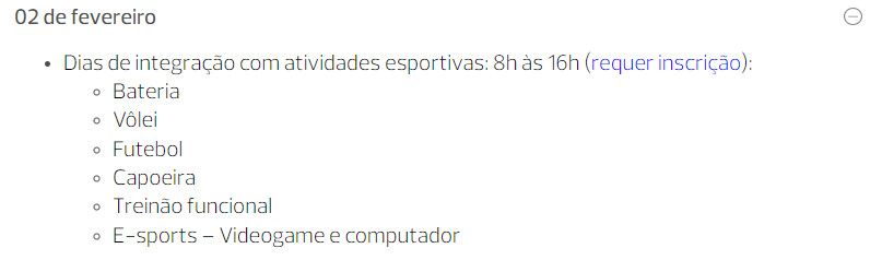 O último dia da semana de boas-vindas será um dia somente de atividades esportivas de integração! Não, não haverá somente futebol! Teremos várias atividades esportivas, como futebol, vôlei, capoeira, fit dance, e-sports (nos laboratórios de computação/realidade virtual/jogos digitais), Bateria Imperial (para os que são apaixonados ou desejam aprender a tocas instrumentos), dentre outras atividades.